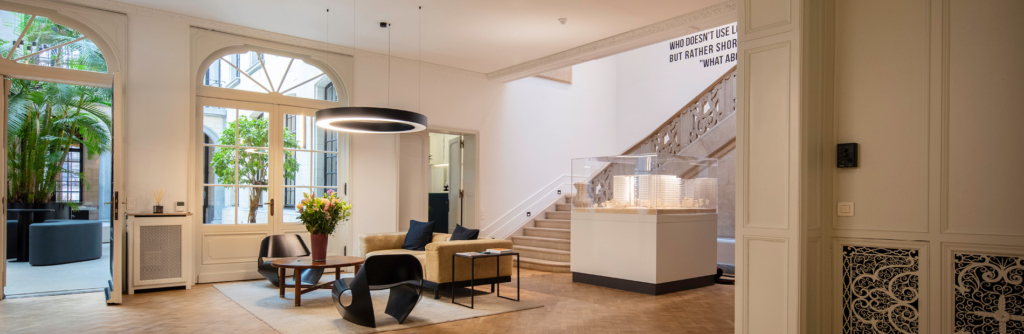 Onze liefde voor vastgoed heeft ons dit imposante herenhuis doen renoveren en inrichten als hoofdkantoor. Het hele gebouw werd zorgvuldig gerestaureerd en historische elementen opgewaardeerd. De moderne inrichting zorgt voor een fris contrast met het klassiekere karakter van de nerorococo stijl, ontworpen door het architectenduo Joseph Hertogs en Gerard De Ridder.